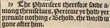 19 The Pharisees therefore saide among themselues, Perceiue ye how yee preuaile nothing? Behold, the world is gone after him.