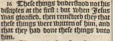 16 These things vnderstood not his disciples at the first: but when Iesus was glorified, then remēbred they that these things were written of him, and that they had done these things vnto him.