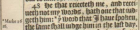 48 He that reiecteth me, and receiueth not my words, hath one that iudgeth him: *þe word that I haue spoken, the same shall iudge him in the last day.[*Marke 16 16.]