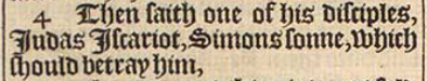 4 Then saith one of his disciples, Iudas Iscariot, Simons sonne, which should betray him,