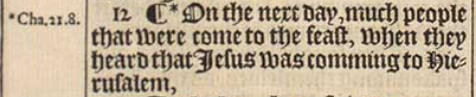 12 ¶ *On the next day, much people that were come to the feast, when they heard that Iesus was comming to Hierusalem,[*Cha.21.8.]