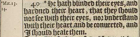 40 *"Er hat ihre Augen verblendet und ihr Herz verhärtet, dass sie mit ihren Augen nicht sehen, noch mit ihrem Herzen verstehen und bekehrt werden und ich sie heilen solle."[*Matthäus 13:14]