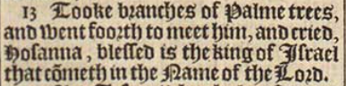 13 Tooke branches of Palme trees, and went foorth to meet him, and cried, Hosanna, blessed is the king of Israel that cōmeth in the Name of the Lord.