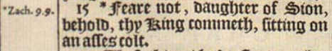 15 *Feare not, daughter of Sion, behold, thy King commeth, sitting on an asses colt.[*Zach.9.9.]