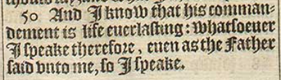 50 And I know that his commandement is life euerlasting: whatsoeuer I speake therefore, euen as the Father said vnto me, so I speake.