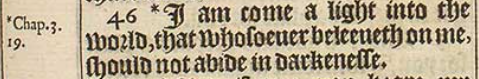 46 *I am come a light into the world, that whosoeuer beleeueth on me, should not abide in darkenesse.[*Chap.3.19.]