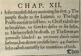 1 Jesus entschuldigt Maria, die ihm die Füße salbt. 9 Die Leute strömen herbei, um Lazarus zu sehen. 10 Die Hohepriester beraten sich, ihn zu töten. 12 Christus reitet nach Jerusalem. 20 Griechen begehren Jesus zu sehen. 23 Er sagt seinen Tod voraus. 37 Die Juden sind meist verblendet: 42 doch viele Oberste glauben, aber bekennen ihn nicht: 44 Darum ruft Jesus eindringlich zum Bekenntnis des Glaubens auf.