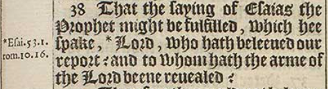 38 That the saying of Esaias the Prophet might be fulfilled, which hee spake, *Lord, who hath beleeued our report? and to whom hath the arme of the Lord beene reuealed?[*Esai.53.1. rom.10.16.]
