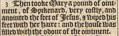 3 Then tooke Mary a pound of ointment, of Spikenard, very costly, and anointed the feet of Iesus, & wiped his feet with her haire: and the house was filled with the odour of the ointment.
