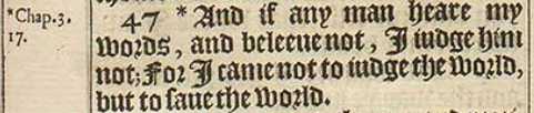 47 *And if any man heare my words, and beleeue not, I iudge him not; For I came not to iudge the world, but to saue the world.[*Chap.3.17.]