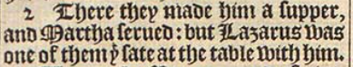 2 There they made him a supper, and Martha serued: but Lazarus was one of them þt sate at the table with him.