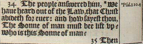 34 The people answered him, *We haue heard out of the Law, that Christ abideth for euer: and how sayest thou, The Sonne of man must bee lift vp? Who is this Sonne of man?[*Psal.110.4.]