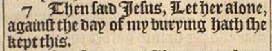 7 Then said Iesus, Let her alone, against the day of my burying hath she kept this.