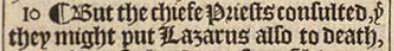 10 ¶ But the chiefe Priests consulted, þt they might put Lazarus also to death,