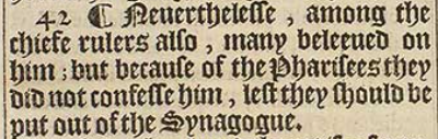 42 ¶ Neuerthelesse, among the chiefe rulers also, many beleeued on him; but because of the Pharisees they did not confesse him, lest they should be put out of the Synagogue.