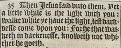 35 Then Iesus said vnto them, Yet a little while is the light with you: walke while ye haue the light, lest darkdesse come vpon you: For he that walketh in darkenesse, knoweth not whither he goeth.