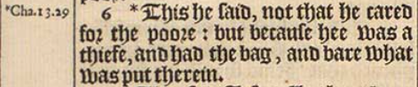 6 *This he said, not that he cared for the poore: but because hee was a thiefe, and had the bag, and bare what was put therein.[*Cha.13.29.]