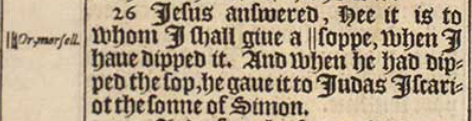 26 Iesus answered, Hee it is to whom I shall giue a ||soppe, when I haue dipped it. And when he had dipped the sop, he gaue it to Iudas Iscariot the sonne of Simon.[||Or, morsell.]