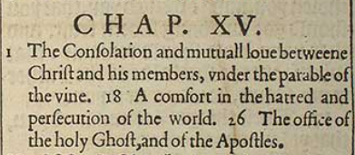 1 Der Zuspruch und die gegenseitige Liebe zwischen Christus und seinen Mitgliedern, gemäß der Parabel vom Weinstock. 18 Ein Trost in Hass und Verfolgung der Welt. 26 Das Amt des Heiligen Geistes und der Apostel.