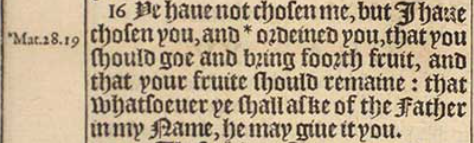16 Ye haue not chosen me, but I haue chosen you, and *ordeined you, that you should goe and bring foorth fruit, and that your fruite should remaine: that whatsoeuer ye shall aske of the Father in my Name, he may giue it you.[*Mat.28.19]