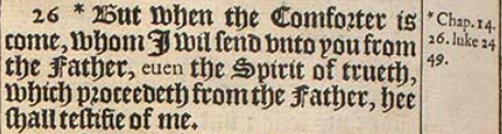 26 *But when the Comforter is come, whom I wil send vnto you from the Father, euen the Spirit of trueth, which proceedeth from the Father, hee shall testifie of me.[*Chap.14.26. luke 24 49.]