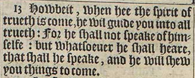 13 Howbeit, when hee the spirit of trueth is come, he wil guide you into all trueth: For he shall not speake of himselfe: but whatsoeuer he shall heare, that shall he speake, and he will shew you things to come.