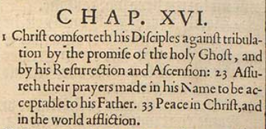 1 Christus ermutigt seine Jünger gegen Drangsal durch das Versprechen des Heiligen Geistes und durch seine Auferstehung und Himmelfahrt. 23 Versichert ihre Gebete, gemacht in seinem Namen, für seinen Vater akzeptabel zu sein. 33 Friede in Christus und in der Welt Bedrängnis.