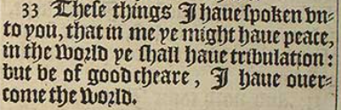 33 These things I haue spoken vnto you, that in me ye might haue peace, in the world ye shall haue tribulation: but be of good cheare, I haue ouercome the world.