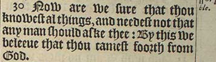 30 Now are we sure that thou knowest al things, and needest not that any man should aske thee: By this we beleeue that thou camest foorth from God.