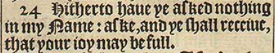 24 Hitherto haue ye asked nothing in my Name: aske, and ye shall receiue, that your ioy may be full.