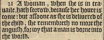 21 A woman, when she is in trauaile, hath sorrow, because her houre is come: but assoone as she is deliuered of the child, she remembreth no more the anguish, for ioy that a man is borne into the world.