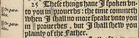 25 These things haue I spoken vnto you in ||prouerbs: the time commeth when I shall no more speake vnto you in ||prouerbes, but I shall shew you plainly of the Father.[||Or, parables. ,||Or, parables.]