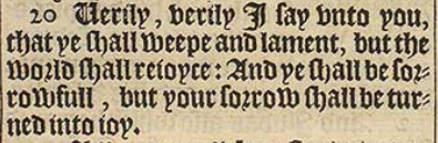 20 Uerily, verily I say vnto you, that ye shall weepe and lament, but the world shall reioyce: And ye shall be sorrowfull, but your sorrow shall be turned into ioy.