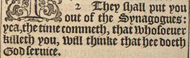 2 They shall put you out of the Synagogues: yea, the time commeth, that whosoeuer killeth you, will thinke that hee doeth God seruice.