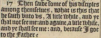 17 Then saide some of his disciples among themselues, What is this that he saith vnto vs, A litle while, and ye shal not see me: and againe, a litle while, and ye shall see me: and, because I goe to the Father?