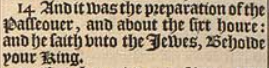 14 And it was the preparation of the Passeouer, and about the sixt houre: and he saith vnto the Iewes, Beholde your King.