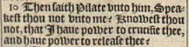10 Then saith Pilate vnto him, Speakest thou not vnto me? Knowest thou not, that I haue power to crucifie thee, and haue power to release thee?