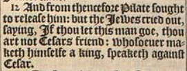 12 And from thencefore Pilate sought to release him: but the Iewes cried out, saying, If thou let this man goe, thou art not Cesars friend: whosoeuer maketh himselfe a king, speaketh against Cesar.