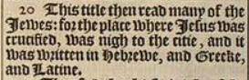 20 This title then read many of the Iewes: for the place where Iesus was crucified, was nigh to the citie, and it was written in Hebrewe, and Greeke, and Latine.