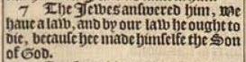 7 The Iewes answered him, We haue a law, and by our law he ought to die, because hee made himselfe the Son of God.