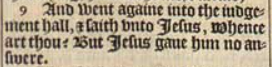 9 And went againe into the iudgement hall, & saith vnto Iesus, Whence art thou? But Iesus gaue him no answere.