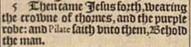 5 Then came Iesus forth, wearing the crowne of thornes, and the purple robe: and Pilate saith vnto them, Behold the man.