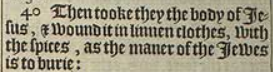 40 Then tooke they the body of Iesus, & wound it in linnen clothes, with the spices, as the maner of the Iewes is to burie: