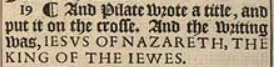 19 ¶ And Pilate wrote a title, and put it on the crosse. And the writing was, IESVS OF NAZARETH, THE KING OF THE IEWES.