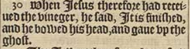 30 When Iesus therefore had receiued the vineger, he said, It is finished, and he bowed his head, and gaue vp the ghost.
