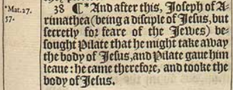 38 ¶ *And after this, Ioseph of Arimathea (being a disciple of Iesus, but secretly for feare of the Iewes) besought Pilate that he might take away the body of Iesus, and Pilate gaue him leaue: he came therefore, and tooke the body of Iesus.[*Mat.27.57.]