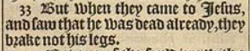 33 But when they came to Iesus, and saw that he was dead already, they brake not his legs.
