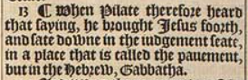 13 ¶ When Pilate therefore heard that saying, he brought Iesus foorth, and sate downe in the iudgement seate, in a place that is called the pauement, but in the Hebrew, Gabbatha.