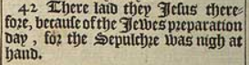 42 There laid they Iesus therefore, because of the Iewes preparation day, for the Sepulchre was nigh at hand.