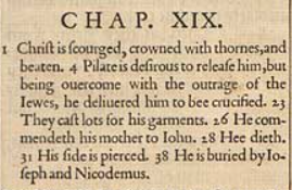 1 Christus wird gegeißelt, mit Dornen gekrönt und geschlagen. 4 Pilatus ist bestrebt, ihn freizulassen, aber von der Empörung der Juden überwältigt, liefert er ihn aus, gekreuzigt zu werden. 23 Sie werfen Lose über seine Gewänder. 26 Er empfiehlt seine Mutter dem Johannes. 28 Er stirbt. 31 Seine Seite ist durchbohrt. 38 Er wird von Joseph und Nikodemus begraben.